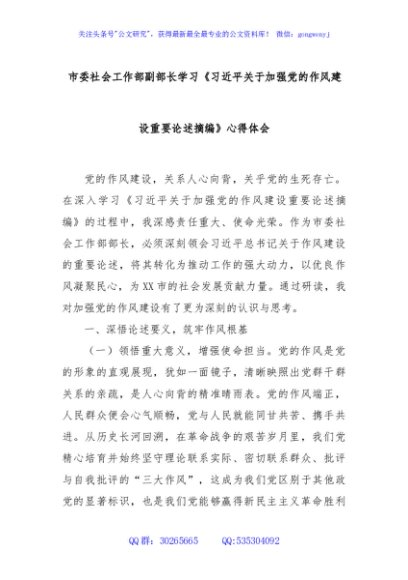 / 市委社会工作部副部长学习《习近平关于加强党的作风建设重要论述摘编》心得体会