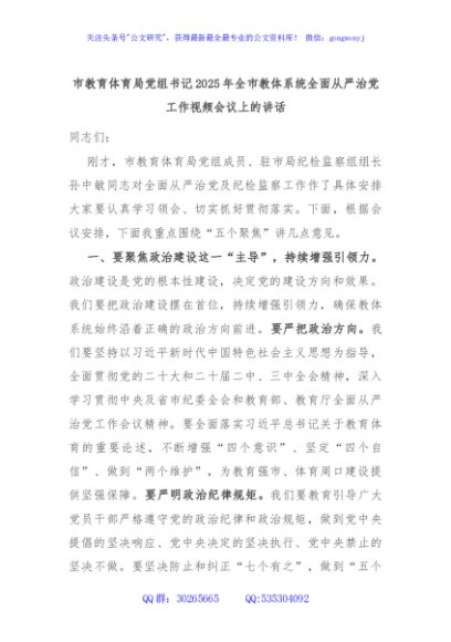 / 市教育体育局党组书记2025年全市教体系统全面从严治党工作视频会议上的讲话