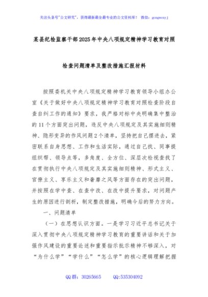 / 某县纪检监察干部2025年中央八项规定精神学习教育对照检查问题清单及整改措施汇报材料