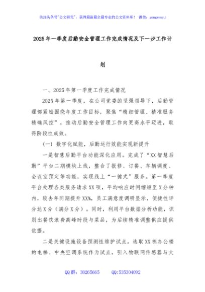 / 2025年一季度后勤安全管理工作完成情况及下一步工作计划