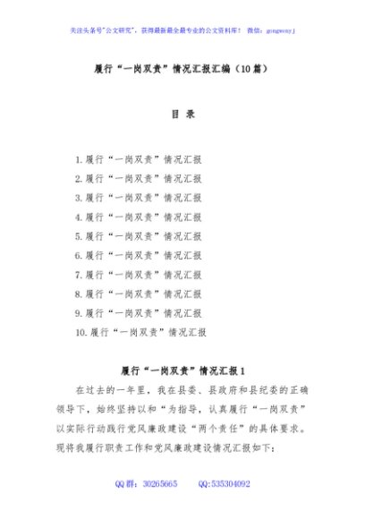 / (10篇)履行“一岗双责”情况汇报汇编