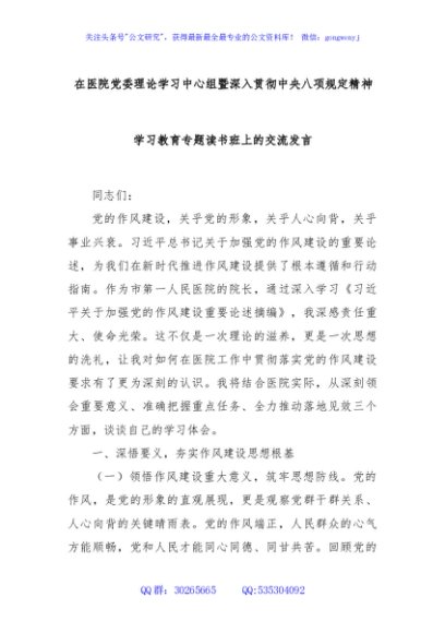 / 在医院党委理论学习中心组暨深入贯彻中央八项规定精神学习教育专题读书班上的交流发言