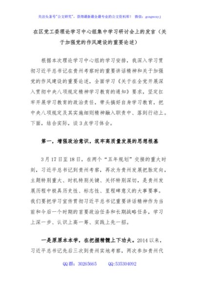 / 在区党工委理论学习中心组集中学习研讨会上的发言(关于加强党的作风建设的重要论述)