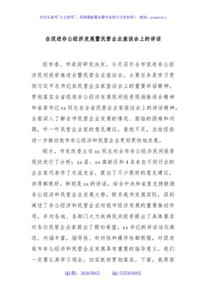 / 在促进非公经济发展暨民营企业座谈会上的讲话