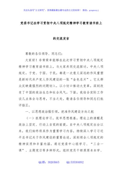 / 党委书记在学习贯彻中央八项规定精神学习教育读书班上的交流发言