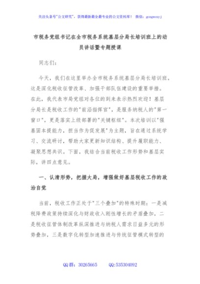 / 市税务党组书记在全市税务系统基层分局长培训班上的动员讲话暨专题授课