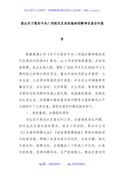 / 国企关于落实中央八项规定及其实施细则精神自查自纠报告