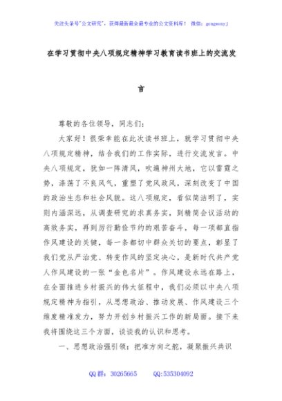 / 在学习贯彻中央八项规定精神学习教育读书班上的交流发言