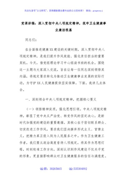 / 党课讲稿:深入贯彻中央八项规定精神,筑牢卫生健康事业廉洁根基