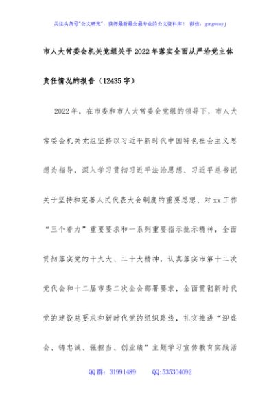 / 市人大常委会机关党组关于2022年落实全面从严治党主体责任情况的报告