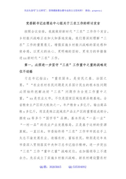 / 党委副书记在理论中心组关于三农工作的研讨发言