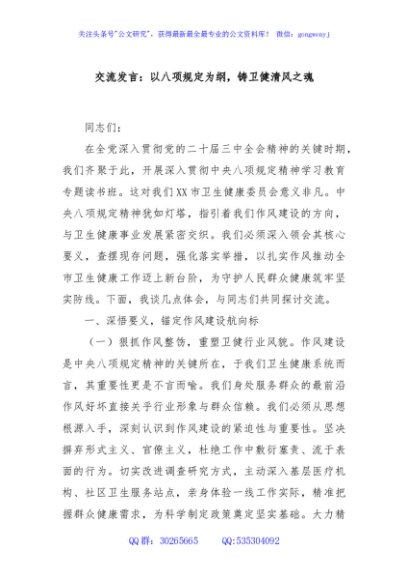 / 交流发言:以八项规定为纲,铸卫健清风之魂