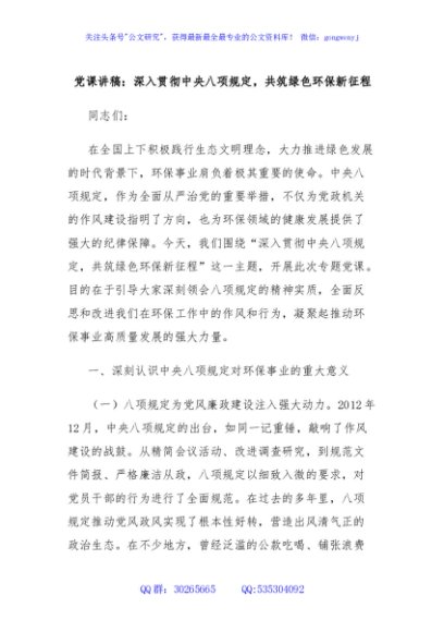 / 党课讲稿:深入贯彻中央八项规定,共筑绿色环保新征程