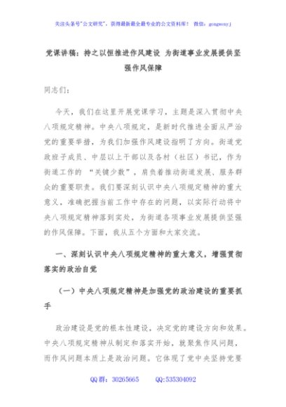 / 党课讲稿:持之以恒推进作风建设 为街道事业发展提供坚强作风保障