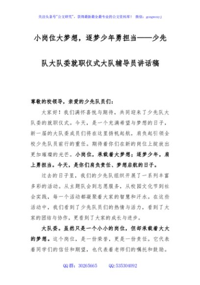 / 小岗位大梦想,逐梦少年勇担当——少先队大队委就职仪式大队辅导员讲话稿
