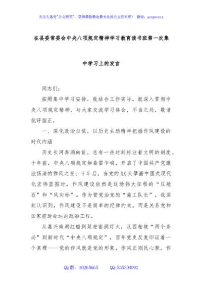 / 在县委常委会中央八项规定精神学习教育读书班第一次集中学习上的发言