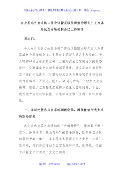 / 在全县办公室系统工作会议暨县级层面整治形式主义为基层减负专项机制会议上的讲话