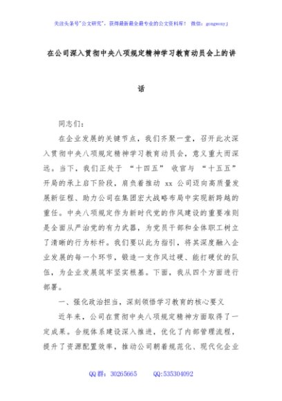 / 在公司深入贯彻中央八项规定精神学习教育动员会上的讲话
