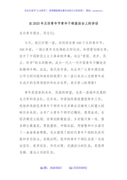 / 在2025年五四青年节青年干部座谈会上的讲话