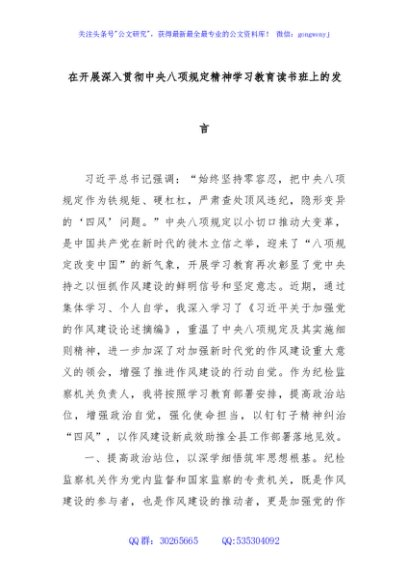 / 在开展深入贯彻中央八项规定精神学习教育读书班上的发言