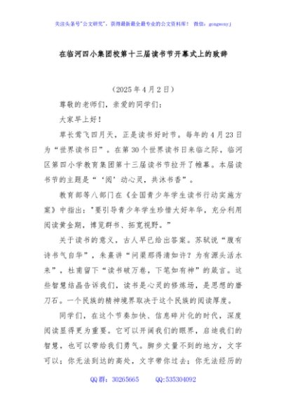 / 在临河四小集团校第十三届读书节开幕式上的致辞
