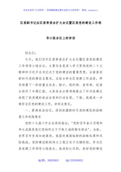/ 区委副书记在区委常委会扩大会议暨区委党的建设工作领导小组会议上的讲话