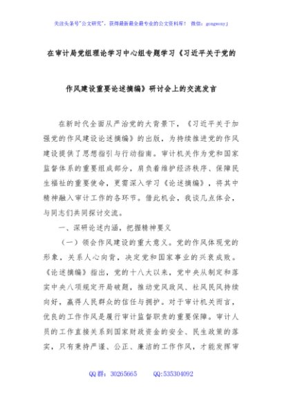 / 在审计局党组理论学习中心组专题学习《习近平关于党的作风建设重要论述摘编》研讨会上的交流发言