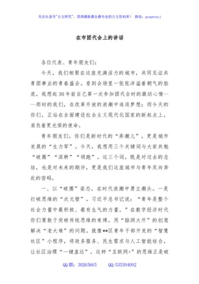 / 在市团代会上的讲话