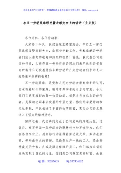 / 在五一劳动奖章颁发暨表彰大会上的讲话(企业版)