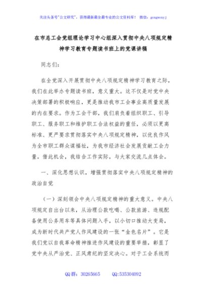 / 在市总工会党组理论学习中心组深入贯彻中央八项规定精神学习教育专题读书班上的党课讲稿