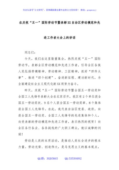 / 在庆祝“五一”国际劳动节暨表彰XX自治区劳动模范和先进工作者大会上的讲话