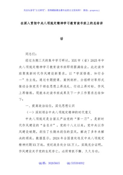 / 在深入贯彻中央八项规定精神学习教育读书班上的总结讲话