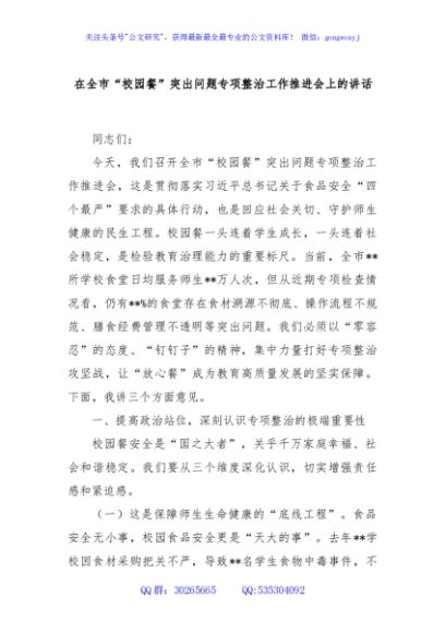/ 在全市“校园餐”突出问题专项整治工作推进会上的讲话