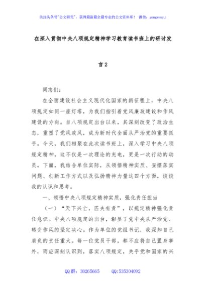 / 在深入贯彻中央八项规定精神学习教育读书班上的研讨发言2