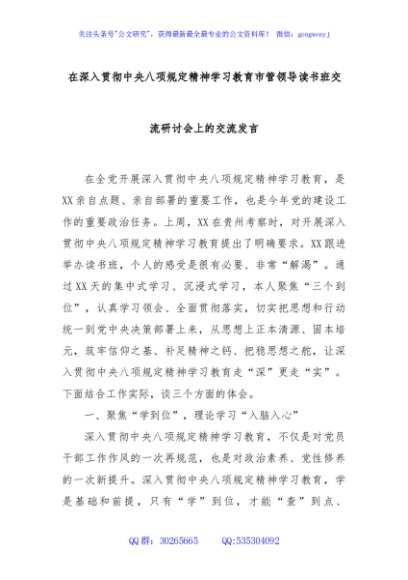 / 在深入贯彻中央八项规定精神学习教育市管领导读书班交流研讨会上的交流发言