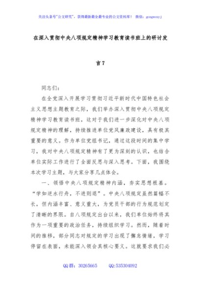 / 在深入贯彻中央八项规定精神学习教育读书班上的研讨发言7