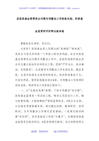 / 县医保基金管理突出问题专项整治工作经验交流:织密基金监管网守护群众救命钱