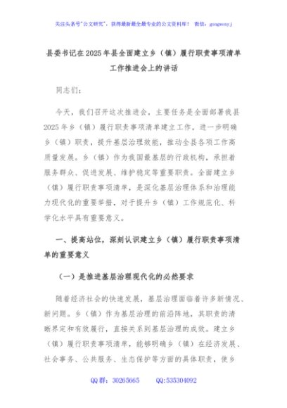 / 县委书记在2025年县全面建立乡(镇)履行职责事项清单工作推进会上的讲话