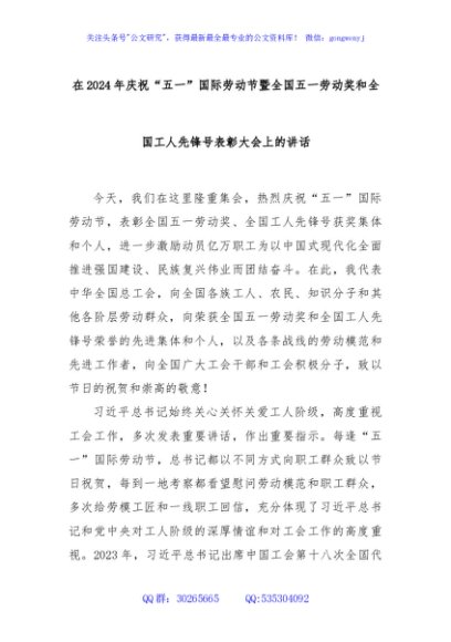 / 在2024年庆祝“五一”国际劳动节暨全国五一劳动奖和全国工人先锋号表彰大会上的讲话