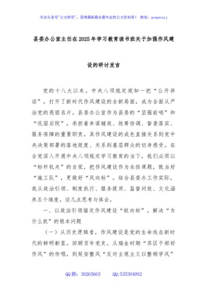 / 县委办公室主任在2025年学习教育读书班关于加强作风建设的研讨发言
