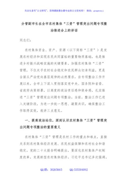 / 分管副市长在全市农村集体“三资”管理突出问题专项整治推进会上的讲话