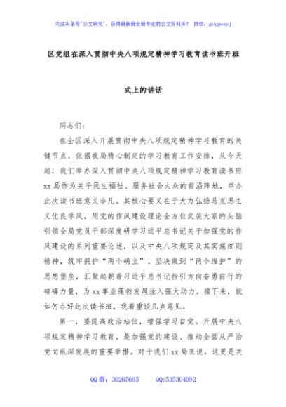 / 区党组在深入贯彻中央八项规定精神学习教育读书班开班式上的讲话