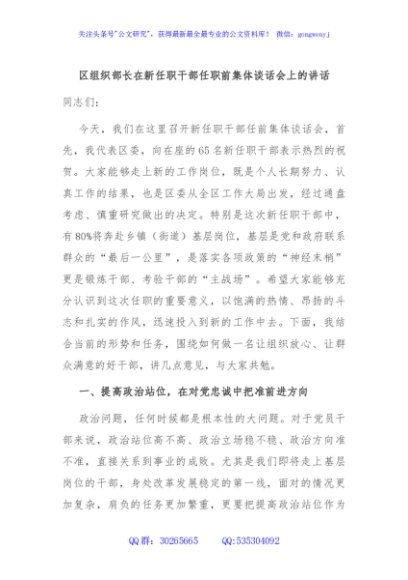 / 区组织部长在新任职干部任职前集体谈话会上的讲话