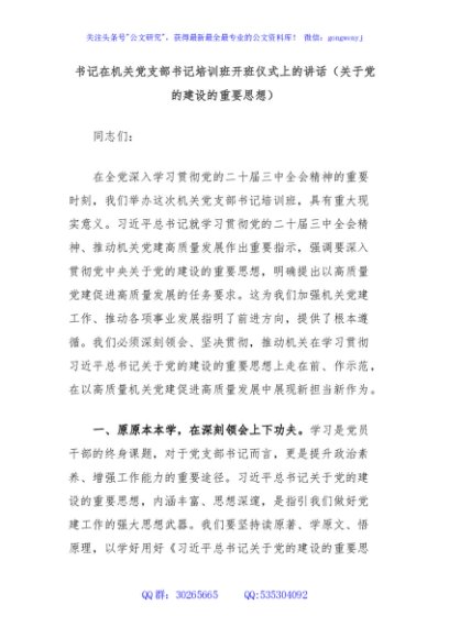 / 书记在机关党支部书记培训班开班仪式上的讲话(关于党的建设的重要思想)