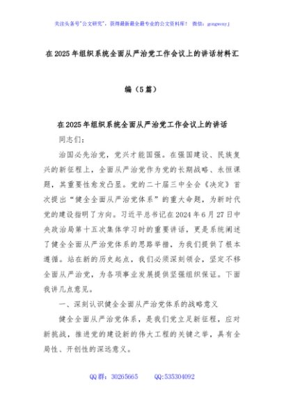 / (5篇)在2025年组织系统全面从严治党工作会议上的讲话材料汇编
