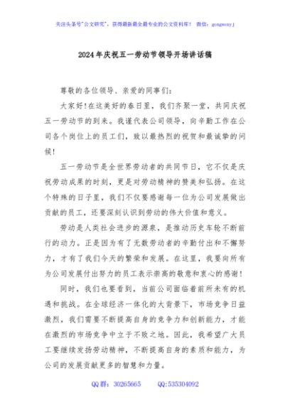 / 2024年庆祝五一劳动节领导开场讲话稿
