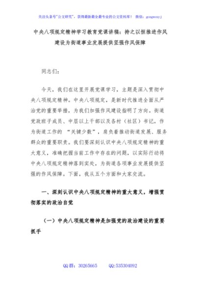/ 中央八项规定精神学习教育党课讲稿:持之以恒推进作风建设为街道事业发展提供坚强作风保障