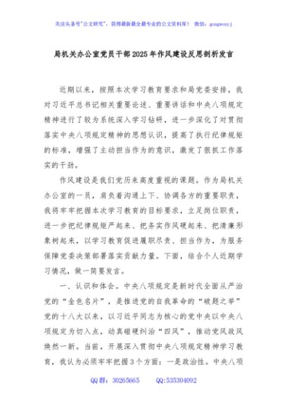 / 局机关办公室党员干部2025年作风建设反思剖析发言