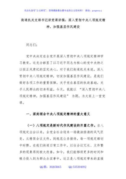 / 街道机关支部书记讲党课讲稿:深入贯彻中央八项规定精神,加强基层作风建设