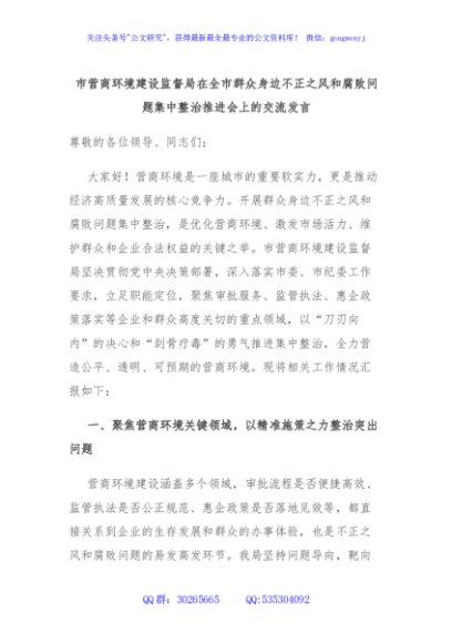 / 市营商环境建设监督局在全市群众身边不正之风和腐败问题集中整治推进会上的交流发言